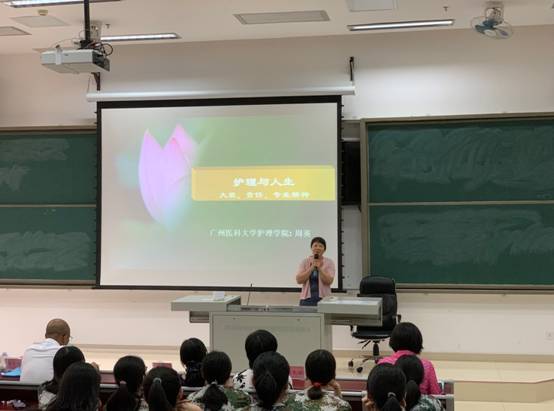 最后,周英院长以《护理与人生——大爱、责任、专业精神》为主题给同学们开展了50分钟的专题讲座,详细地介绍了护理学的起源、发展与未来,护理教育的发展历程,人才培养模式、就业前景等多个方面,内容翔实有趣,鼓励大家从广医起航,迈向未来,走向世界。同学们均表示受益良多。