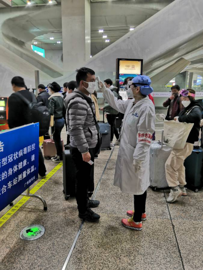 我院2016级护理学专业李慧景同学在广州南站给乘客测量体温