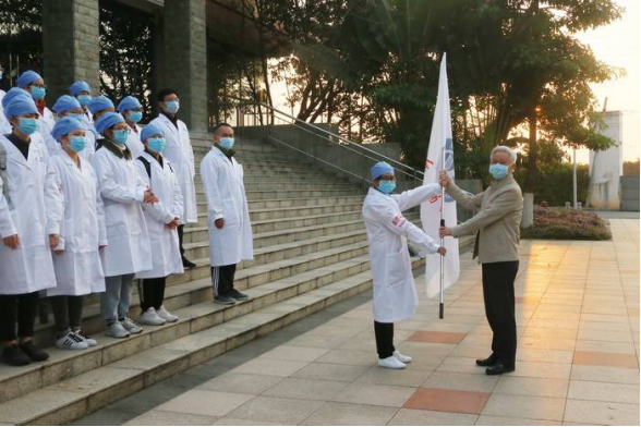 根据上级要求,1月30日我校开始组建学生志愿队伍,征集志愿者的消息发出后,我院学生踊跃响应报名,共有8名护理学专业的学生加入首批志愿队伍,他们在指导老师和辅导员的带领下,分班次前往广州南站等广州主要交通站点开展测量体温等志愿服务。2月1日志愿者出征仪式上,学校党委书记冉丕鑫为队伍授旗,王新华校长等学校领导为队伍助威壮行。