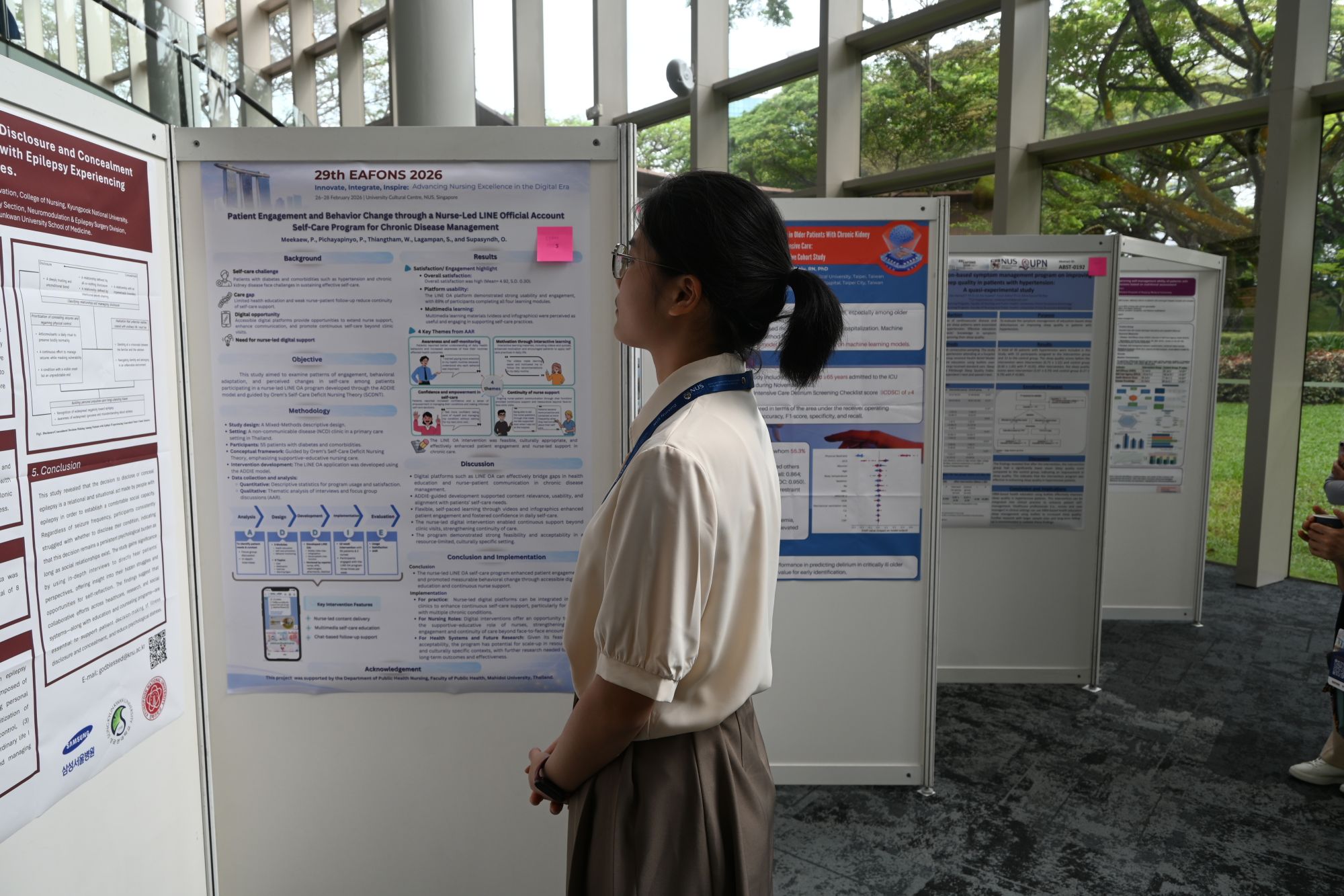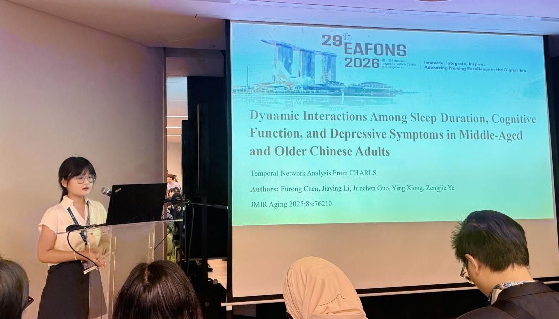 2026年2月26日至28日,第29届东亚护理学者论坛(EAFONS 2026)在新加坡国立大学举行。本届论坛以“创新、整合、激励:在数字时代推进护理卓越”为主题,汇聚了来自全球 40 多个国家和地区的 1800 余名护理领域研究者、教育工作者及政策制定者。广州医科大学护理学院博士研究生陈付蓉、2023级本科生刘烨、2024级本科生林敏晶三名学生代表参会,通过口头报告和电子海报展示等形式,与海内外同行深度交流研讨,展现了广医护理学子的专业风采与学术素养。